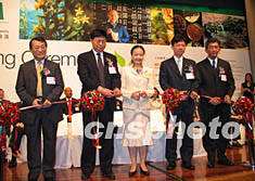 为推动香港发展成国际化中医药研究及贸易中心,贸发局首次办“国际现代化中医药及健康产品展览暨会议”。图为贸发局署理行政总裁黎黄霭玲(中)于十四日为开幕式剪彩。作者:裘之越
