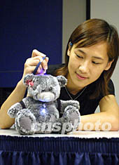 香港科技大学物理学系学生,8月14日示范安装紫外线感应器的熊宝宝玩具,该产品以不同颜色的灯(绿、白、蓝、红)显示紫外线的强度发出警号。萧纾昊 摄