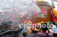 八月十五日,中国著名啤酒企业“青岛啤酒”迎来百年华诞。青岛啤酒新百年第一桶啤酒十五日上午正式开启。中新社记者:张炜