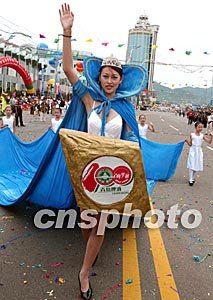 八月十五日,青岛啤酒百年庆典暨第十三届青岛国际啤酒节正式开幕。图为身披蓝色斗篷的“啤酒女神”在开幕式上亮相。中新社记者:张炜