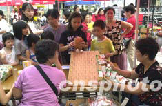 图为市民和游客兴致勃勃地参加有奖游戏活动。