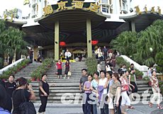 大批内地市民前来澳门观光游览,图为星期天葡京酒店前游客如鲫,纷纷在酒店前合影留念。中新社记者:李刚