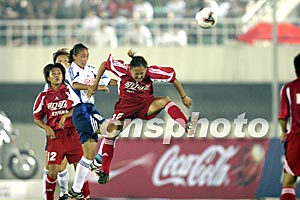 八月十七日,2003年“可口可乐”杯中国女足南北明星争霸赛在北京举行,双方在比赛中争抢异常激烈。最终,北方明星队以4比1战胜南方明星队。中新社记者:盛佳鹏