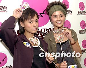 乐坛组合Twins两名成员钟欣桐(阿娇)、蔡卓妍(阿Sa)(左起)8月20日在香港出席新城电台节目《联Fan所》之“爱菩私家访”访问,由于Twins新唱片于九月推出,电台DJ送上玩具后冠、令牌,比喻港姐快将出炉。作者:邓庆乐