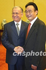 中国全国人大常委会委员长吴邦国,二十一日在北京人民大会堂会见来访的罗马尼亚总统伊利埃斯库。中新社记者:毛建军