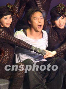 香港歌星陈弈迅,在二十三日晚(石+勘)香港体育馆举行的2003年度香港小姐竞选决赛上演唱 。中新社记者:钱兴强
