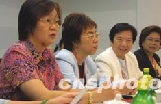 中国妇女第九次全国代表大会澳门特别行政区特邀代表团二十四日在京进行分组讨论,澳门妇女联合会会务顾问杨秀雯(左一)对本次大会工作报告表示肯定。中新社记者:廖文静