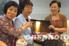 江西与澳门妇女代表成为联谊“姊妹团”,澳门妇女联合会副会长贺定一(左二)与江西妇联主席李亚平(右一)互赠礼品。江西代表团赠送文房四宝祝愿澳门妇联书写浓墨重彩的新篇章。中新社记者:廖文静
