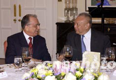香港行政长官董建华(右)八月二十五日在礼宾府设宴招待罗马尼亚总统扬伊利埃斯库。中新社 图