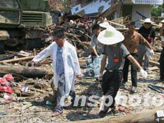 图为搜救人员从现场抬出一具尸体。作者:刘可耕