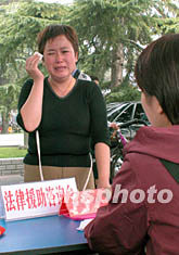 8月31日,郑州市一位因经济困难而没有委托诉讼代理人的女性在接受免费的法律服务。当日郑州市许多法律援助中心走上街头,宣传将于9月1日实施的《法律援助条例》,并为求助的人员提供免费的法律帮助。作者:慎重