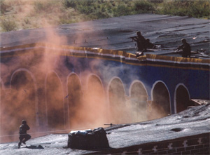 “恐怖分子”占领某镇后,破坏了公路和交通要道,布设了地雷和障碍,构筑了地堡、工事、据点,企图与我武力对抗。由空军航空兵、陆军航空兵、炮兵分队、电子干扰分队、装甲分队、技术侦察分队、特战分队、侦察分队、武警和民兵巡逻队、军犬队组成的联合打击群,与“恐怖分子”实行决战。