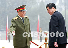 中央军委副主席、国务委员兼国防部长曹刚川九月三日在北京主持仪式,欢迎来访的日本防卫厅长官石破茂。中新社记者:毛建军