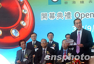 亚洲最大型的钟表展“香港钟表展2003”,九月三日在香港会展中心揭幕,来自世界各国及内地、香港的七百多家参展商参展。图为香港财政司司长唐英年在开幕式上致辞。中新社记者:钱兴强