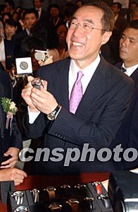 亚洲最大型的钟表展“香港钟表展2003”,九月三日在香港会展中心揭幕,香港财政司司长唐英年在展会上参观。中新社记者:钱兴强