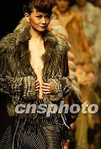中国当代六位最优秀的时装设计师,今秋十月十三日将在法国巴黎时装周上展示新作,中国最优秀的十名模特为她们表演极具东方魅力的中华时尚服饰。图为中国设计师武学凯的皮草新作。中新社记者:贾国荣