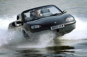 图为一辆在泰晤士河上高速行驶的汽车。吉布斯科技生产的这辆水陆两用汽车陆地时速100英里,水面时速30英里。(AP Photo/ Stefan Rousseau, PA)