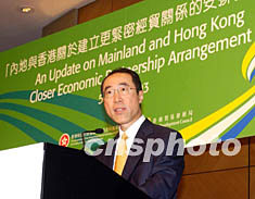 香港财政司司长唐英年五日出席由香港贸易发展局举办的“内地与香港关于建立更紧密经贸关系安排”最新进展交流会。图为唐英年致开幕辞。中新社图