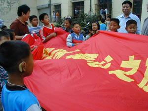 沧州聋哑学校的孩子们触摸爱心——“爱心之旅”采访团受到聋哑儿童的欢迎。华夏时报图