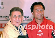 九月八日下午,即将参加十日举行的雅典奥运会足球预选赛的中国U23队(国奥队)主教练沈祥福(右)和叙利亚队主教练沙马斯(左)在昆明举行联合记者会。中新社记者:张炜