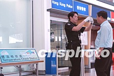 香港卫生署对新加坡出现SARS疑似病例发表声明,将密切留意,保持高度戒备,图为九日香港国际机场严格测量体温措施到位不松懈。作者:潘索菲