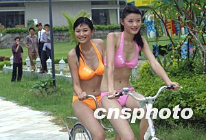 经过几天在海南三亚的赛前培训,九月十日,参加2003年新丝路中国模特大赛的五十一名佳丽到海滩上放松心情,舒缓大赛前的紧张气氛。中新社记者:盛佳鹏