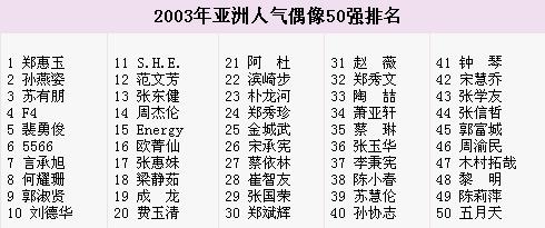 据联合早报报道,“2003年亚洲人气偶像50强”投选范围包括从事演艺、歌唱、体育、模特儿及服装界的亚洲人士。经过5周热烈的投票,吸引将近7万张选票。