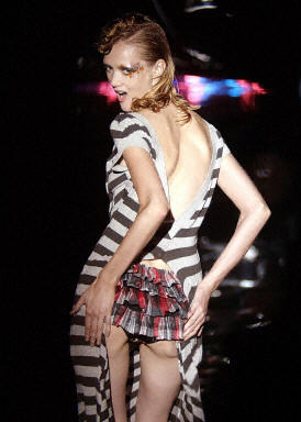 9月10日,在西班牙巴塞罗纳2004春夏时装展上,模特现场展示了西班牙设计师Mireya Ruiz的新作。