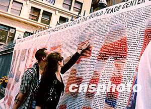 美东时间九月十一日,数以千计的普通市民前往纽约世贸中心废墟遗址,凭吊两年前“九一一”恐怖袭击事件中的遇害者。图为遇害者亲属抚摸镌刻在大理石墙上的亲人的名字。作者:龚文谟