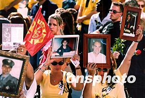 在“九一一”恐怖袭击事件中逝去的纽约消防员亲属们,手举亲人的照片,参加在世贸中心遗址举行的纪念活动。作者:龚文谟