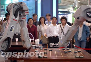 为期四天的第六届中国北京国际科技产业博览会十二日在北京拉开序幕,首钢集团展出的机器人象棋表演赛吸引观众。中新社记者:张宇