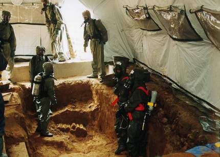 在“中方协助团”防化专家的带领下,记者穿戴好一整套厚重严密的防化服,戴好防毒面具,经过作业保障区,接受过防毒面具气密性检测后,进入被称为“高毒、高爆、高危险”的作业污染区。