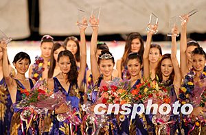 九月十四日晚,2003年新丝路中国模特大赛决赛在海南三亚天涯海角举行,肖青(左三)获得本次大赛冠军,谷雨(左二)、姚瑶(左四)获得大赛亚军,张晓雯(右一)、罗君(右二)以及来自台湾的选手吴育臻(左一)获得本次大赛季军。中新社记者:盛佳鹏