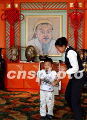 吉林省松原市郊的查干湖畔如今新建了许多观光蒙古包,年幼的蒙古族男孩在中国元代英雄成吉思汗的肖像前持刀照相。成吉思汗的蒙古铁骑大军曾经驰骋欧亚大陆而名垂青史。中新社记者:贾国荣