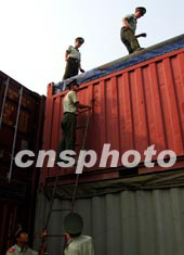 辽宁丹东港边防检查站的解放军九月在丹东市大东港码头对集装箱进行检查。这个港口与韩国和日本货运交往每年大幅递增,由于偷渡人员采用集装箱躲藏现象较多,边防武警十分注重对集装箱的检查。中新社记者:王丽南