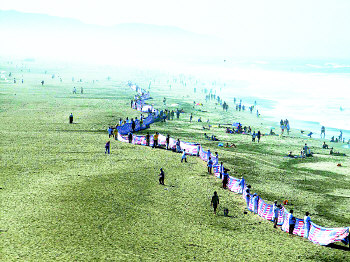 中新网9月15日电 由旧金山华裔艺术家赵建海设计的大地艺术作品旗海“自由颂”,九月七日在纽约自由神像岛上飘扬,13日再现旧金山市海滩。