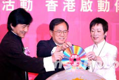 香港旅游发展局9月15日推出全新的「香港-乐在此,爱在此!」全球广告宣传活动,政务司长曾荫权[中]、旅游发展局主席周梁淑怡[右]及香港旅游大使成龙出席主持启动仪式。作者:洪少葵