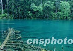 钙华池山泉水里倒伏着松树,此景距九寨沟口四十九公里,沿途是高山森林。