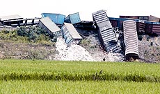 记者看到,脱轨的车厢共有19节。有两节车厢完全横在了铁路中央,另几节侧翻在铁路一侧,还有两节冲下了铁路路基,多处铁轨呈弯曲状,许多车厢的车轮已经飞落到周围的稻田里,路边的几根电线杆被连根拔起。列车上集装箱内的瓷砖、大理石等散落一地。据有关部门认定,脱轨车厢位于列车第27至45节。南昌铁路局目前已组织人员在现场进行紧急救援。