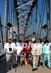八十五岁的韩国黄姓老人(左)9月中旬带着全家十一口人,从汉城来到中国边境城市丹东,在鸭绿江大桥上翘望对面的朝鲜。五十年多年前朝鲜战争时,他与在朝鲜新义洲的女儿分离后再也没有见过面。中新社记者:王丽南