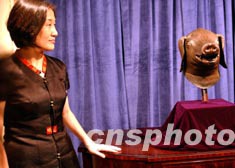 中华社会文化发展基金会,九月十八日在香港举行“抢救流失海外文物”新闻发布会,中华社会文化发展基金会官员在会上向香港传媒介绍流失海外文物《清.圆明园猪首铜像》。 中新社记者:钱兴强