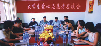 10日下午,太阳星城爱心之旅采访团抽身回京,与北京大学、清华大学等京城十余所著名大学的爱心志愿者面对面,聆听学子们对于爱心的理解。