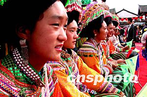 九月二十一日,云南的丽江建立为城市的庆典上,衣着艳丽的傈僳族姑娘格外漂亮。在丽江市人口一百一十一万中,纳西、彝、傈僳等十二种少数民族占百分之五十七点三。中新社记者:纳家骅