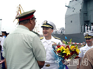 中新网湛江9月22日电(徐建恩)美国第五舰队两艘军舰考佩斯(Cowpens)号和范德格里夫号今日上午九时驶入广东湛江港码头,这是美舰对中国海军南海舰队的首次访问,美太平洋舰队第五航母大队司令詹姆斯·凯利准将随舰访问。