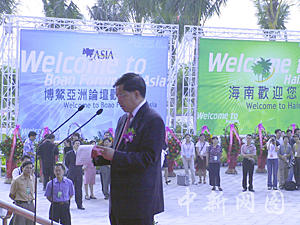 由中远集团投资建设的博鳌亚洲论坛永久会址——博鳌亚洲论坛国际会议中心二十二日揭幕,博鳌亚洲论坛秘书长龙永图在揭幕典礼上致词。中新社记者 关向东 摄
