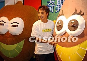 香港歌手方力申,九月二十三日以ZESPRI宣传大使身份在庆祝会上与“奇异果卡通形象”在一起。中新社记者:钱兴强