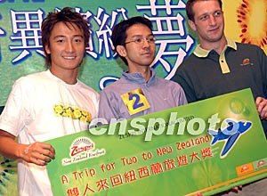 香港歌手方力申,九月二十三日在香港举行的“ZESPRI奇异黄金梦庆祝会”上主持问答游戏。图为一名参赛者获得双人往返纽西兰旅游大奖。中新社记者:钱兴强