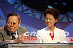 九月二十六日,2003年国际大专辩论会决赛在北京中央电视台演播厅举行,诺贝尔奖获得者杨振宁(左)担任辩论会的点评嘉宾。中新社记者:盛佳鹏
