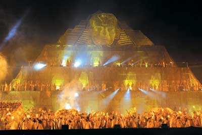 夜色中,雄伟的埃及金字塔在绚丽的灯光映衬下显得格外迷人。欢呼的人群,凯旋的勇士,齐放的礼花,昨晚工体数万观众在这里领略了世界上最大场面的演出。