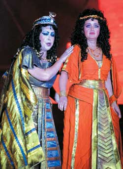 尽管专业气象台一直预报演出时无雨,但是昨天一天的天气都十分阴沉,让人不禁为这场演出捏了一把汗。可是老天有眼,到了傍晚时天气变得格外的好。当晚八时,《阿依达》在万众企盼中终于热闹开场。一阵优美的前奏之后,美丽的埃塞俄比亚公主阿依达翩然出场。金字塔在绚丽灯光的映衬下,透着迷人的光晕。冰岛男高音歌唱家克里斯蒂安·约翰逊扮演的男主角拉达梅斯、意大利著名男低音歌唱家佳尤蒂扮演的大祭司等剧中角色依次出场,洪亮的嗓音和优美的唱腔不时博得观众的阵阵掌声。